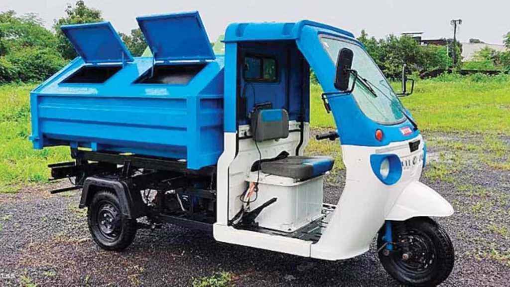 The vehicle features an open cargo bed or a covered container designed for collecting and temporarily storing solid waste.